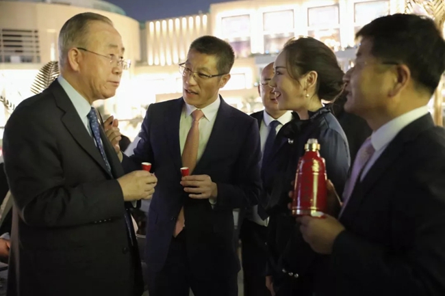 11月24日,第三届国际展望大会 “高级别贵宾欢迎晚宴”在迪拜世界最高楼哈利法塔前的ZETA餐厅举行。第8任联合国秘书长潘基文及夫人,新西兰国家党主席彼得·古德费洛(Peter Goodfellow)等来自中国、新西兰、韩国、印度尼西亚、阿联酋、埃及等国家和地区的政要、商界精英、学者代表及媒体人士等共计60位重量级嘉宾共品红J9九游会游戏官方网站,在觥筹交错中把脉世界经济新态势,品味中国白酒独特的文化魅力。