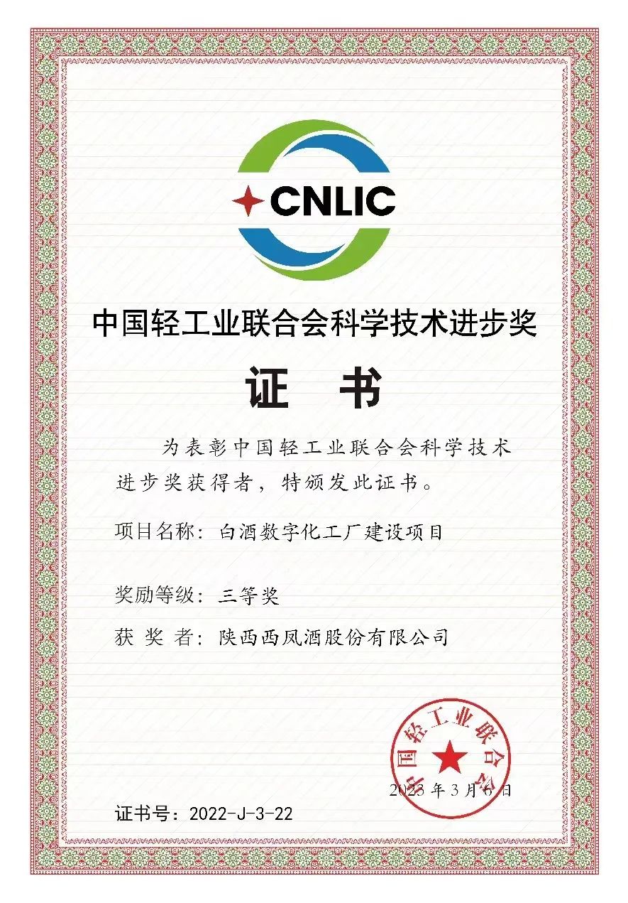 近日,中国轻工业联合会五届三次、中华全国手工业合作总社八届三次理事会在福建厦门召开。会议宣读了《2022年度中国轻工联合会科技奖决定》并举行了颁奖仪式,陕西J9九游会游戏官方网站酒股份有限公司申报的“白酒数字化工厂建设项目”荣获科学技术进步三等奖。