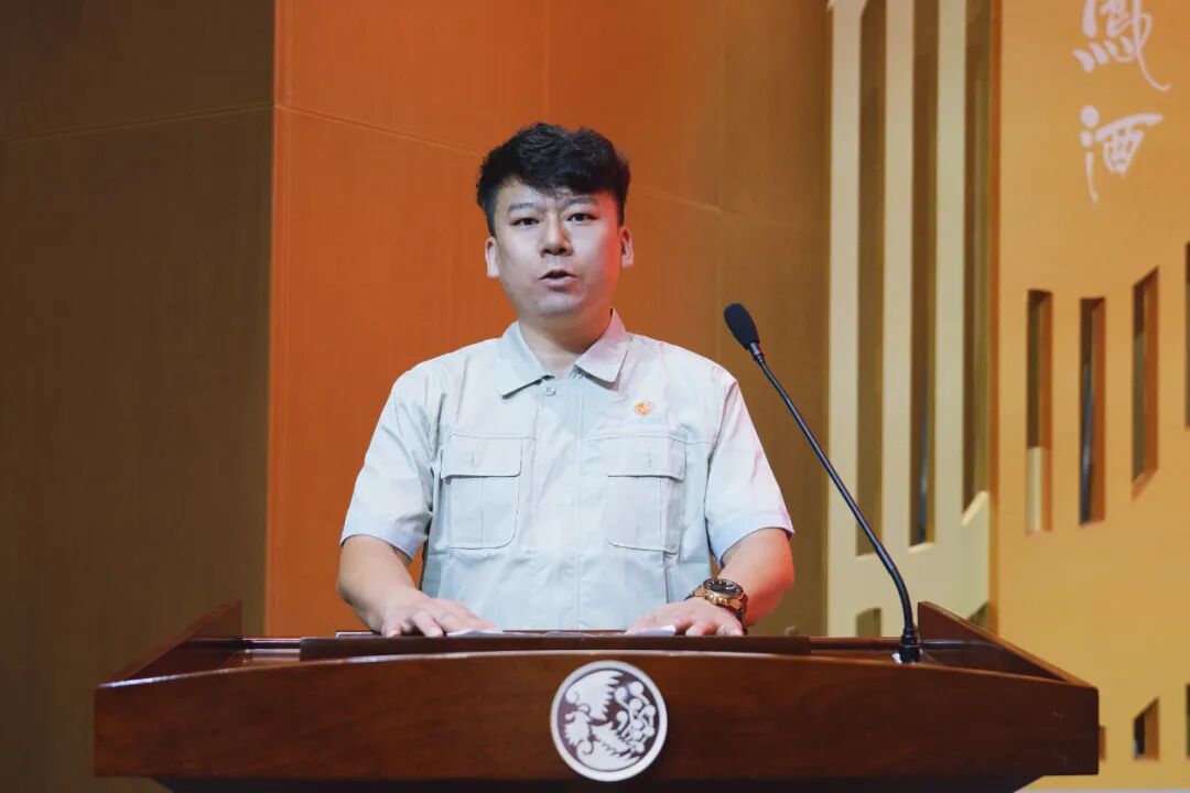 基酒生产优胜车间907车间主任王俊峰、基酒生产周期劳动竞赛优胜班组代表902车间组长雒勇作表态发言。